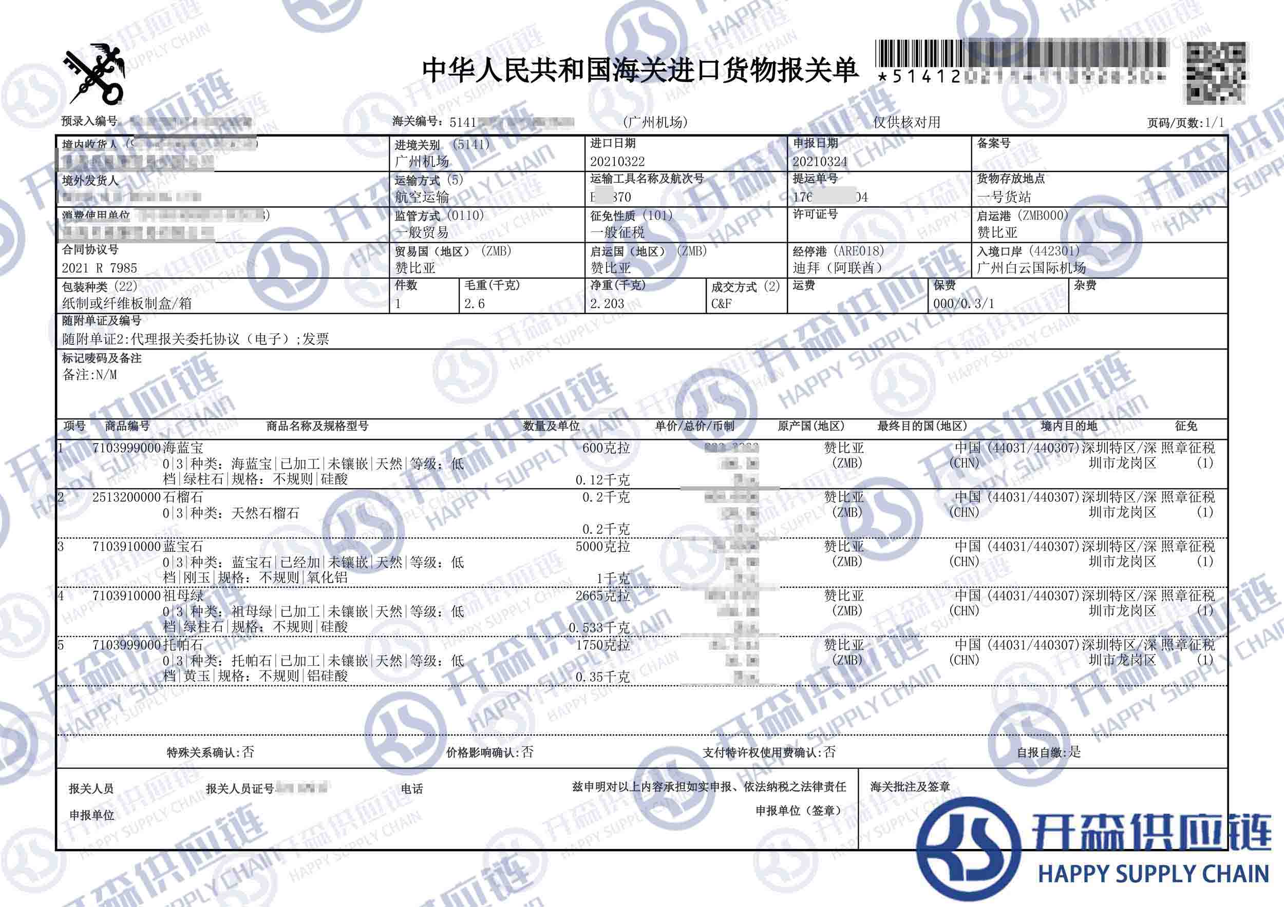 【本文結(jié)語】 上述就是贊比亞藍寶石進口報關代理案例【經(jīng)典案例】的全部內(nèi)容,希望能對您有所幫助,如有寶石進口報關上任何疑問及問題可隨時在線聯(lián)系我們或撥打 18002611553,開森供應鏈擁有豐富的寶石進口報關操作經(jīng)驗及案例,10余年進口經(jīng)驗為您所用,各類進口疑難都能為您一一解答及協(xié)助快速處理解決!